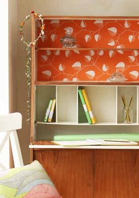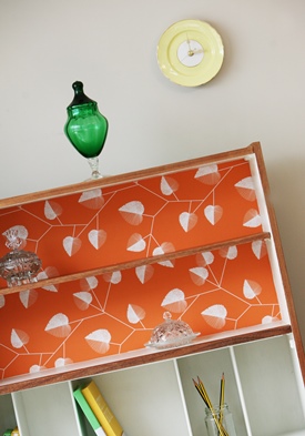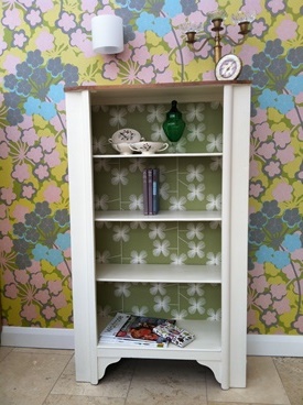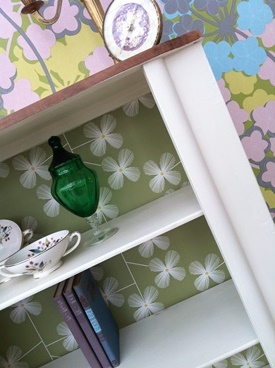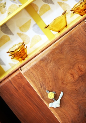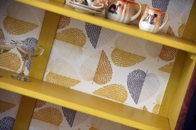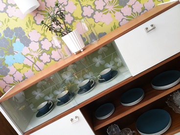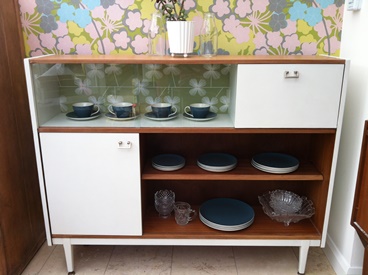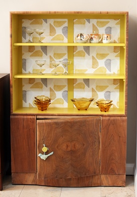 This 1955 cabinet is painted in Annie Sloan chalk paint English yellow with Habitat wallpaper lining the back and inside of the cupboard.