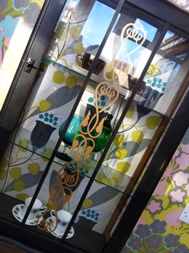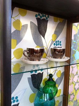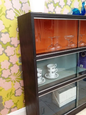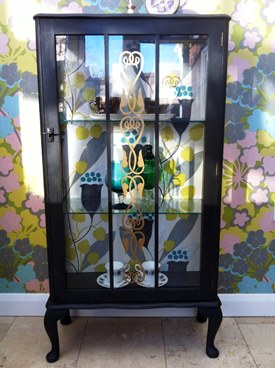 The cabinet retains its original key, lock and glass shelves but we have recovered the back with a stunning Sanderson wallpaper which complements the Graphite grey paint.