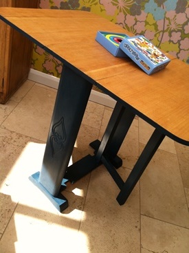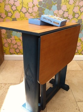 The table top is sanded and waxed showing the simple beauty of the wood. The legs and table edges are painted with Annie Sloan Aubusson Blue, a stunning deep colour which would complement many colour schemes.