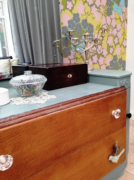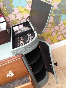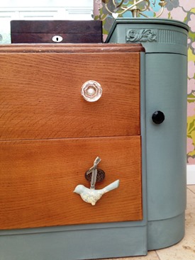 The dressing table has been painted with Annie Sloan Duck Egg and the drawer fronts have been sanded and varnished. The inside of the cupboards are painted a dark and delicious Annie Sloan Graphite and the drawers are lined with Laura Ashley wallpaper.