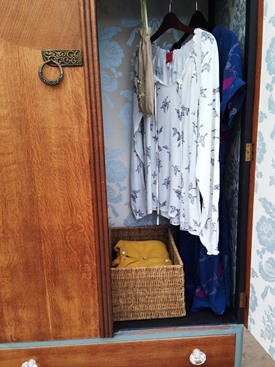 This very beautiful 'Imogen' wardrobe has been fully renovated. The doors and drawer fronts have been sanded and varnished and the rest is painted with Annie Sloan Duck Egg. Inside, we have used Annie Sloan Graphite and a Laura Ashley wallpaper.