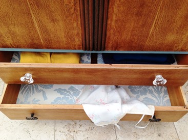The fittings are original apart from two new glass handles on the bottom drawer.