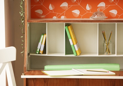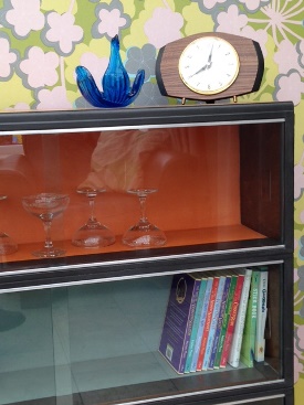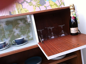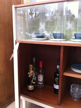 A simple but very stylish cabinet with two cupboards, a shelved section and a sliding glass door section which is lined in soft green and cream Habitat wallpaper.