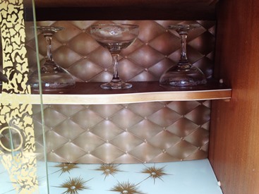 It is wooden construction with a vinyl grey wood effect surface. It has glass sliding doors opening onto a beautiful glass and fabric cabinet in wonderfully original condition.